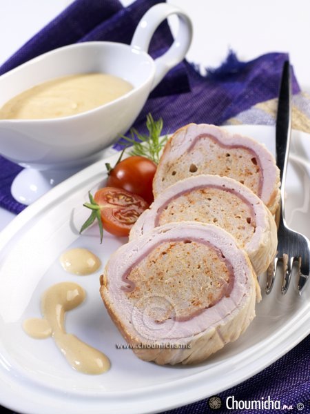 - تزين كل شريحة دجاج بقطعة الديك الرومي المدخن وحصة من الدجاج المفروم المتبل.