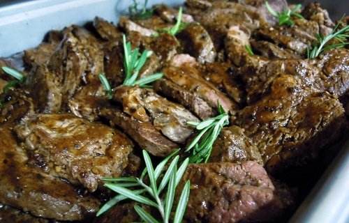 - في وعاء نقوم بوضع شرائح اللحم وتتبل بالملح والفلفل والبهارات وزيت الزيتون وتترك لمدة نصف ساعة حتى تتشرب اللحمة التتبيلة.