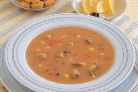 - يُضاف الماء، مغلّف شوربة الفطر ماجي، الذرة الحلوة والحبق المجفف.