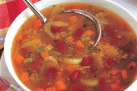 - يوضع البصل المفروم، والثوم، وشرائح الكرفس، والطماطم، ومكعبات الجزر، والفاصوليا الحمراء، والماء في قدر كبيرة. يُغلى المزيج، ويُغطّى ويُترك على نار خفيفة لمدة 10 دقائق.
