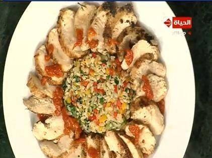 العصفور في طبق التقديم ونرص الدجاج المشوي المقطع شرائح وفوقه صلصة