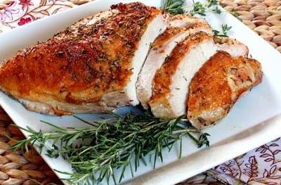 4. احضري صينية كبيرة وضعي فيها صدور الديك الرومي وعليها المقادير ثم ضعيها في الفرن في درجة حرارة 170 حتى ينضج تماما .