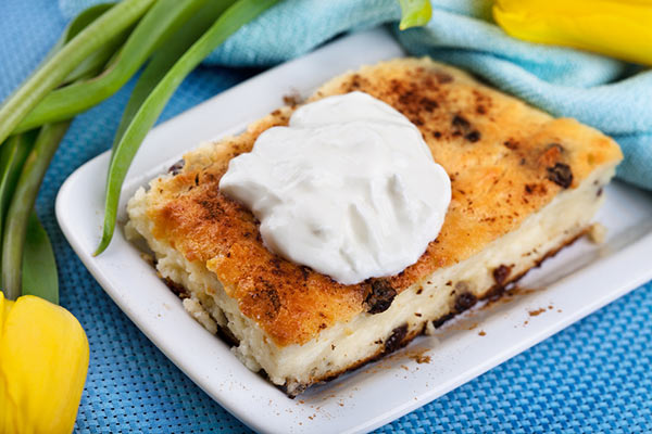 5. يتمّ إخراج الجبنة من الفرن ويُسكب القطر بشكل متجانس فوقها وممكن تزيينها بالكريمة المخفوقة ثم تُقدّم.