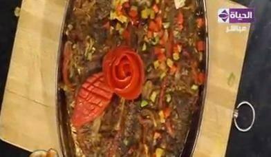 وفي صينية فرن نضع الخليط وفوقه السمك ثم باقي الصوص وندخله الفرن إلى أن