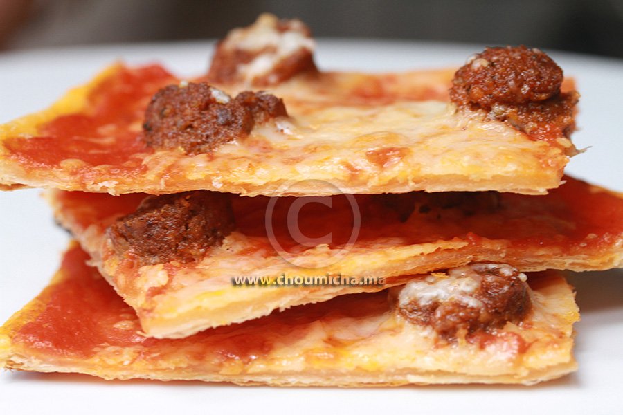 يدهن العجين بصلصة الطماطم. يزين بنقانق الكبد المقطعة ثم ينثر فوقه الجبن المبشور.