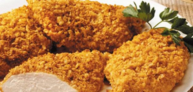 - تزال قطعة من صدور الدجاج وتغمس بالبيض ومن ثم بالبقسماط المتبل، وتكرّر العملية مع كامل قطع صدور الدجاج، وبعدها توضع القطع في وعاء وتعاد إلى الثلاجة لمدة ساعة، وهذا السر في بقاء البقسماط على القطع.