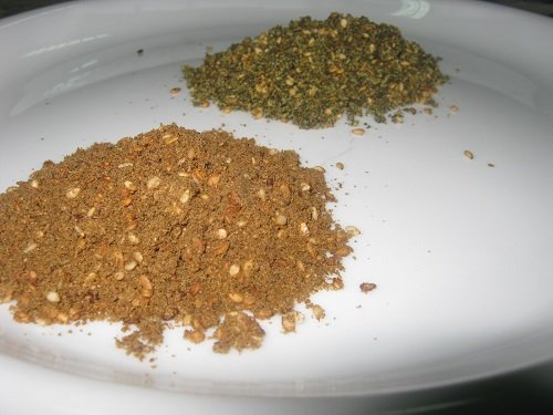 1- في وعاء عميق نضع كمية الحمص المحمص المطحون ونضيف اليه الكزبرة والكمون واليانسون والميرمية والسماق ونخلط المكونات جيدا