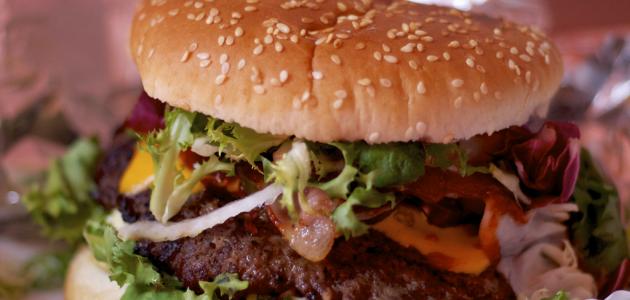- دهن الخبز بكمية المايونيز المتبقية من جهة الوجه المحمص، ووضع البرجر فوقه، وتقديمه مع الخس وشرائح البندورة والجبنة.