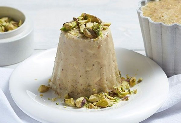 - عندما يصبح الكولفي جاهزاً للتقديم، اغمسي قاعدة كل قالب بماء حار ثم اقلبي الكولفي على طبق التقديم. ورشي الوجه بالفستق الحلبي.