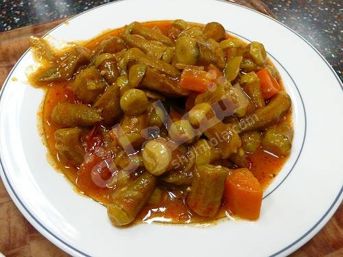 4. ضعي البامية على خليط الفلفل الأخضر و البصل و اتركيها لمدة 5 دقائق و قلبي.