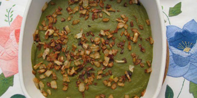 ضعي البصارة في اطباق التقديم ثم زينيها بالبصل المحمر و قدميها.