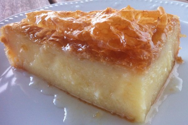 - اخبزي الطبق حتى يحمر الوجه وتستقر الحشوة، لمدة 50 – 1 ساعة. أخرجيه من الفرن، ومباشرة، اسكبي ¼ كوب من القطر المبرد على الوجه، وتأكدي من توزيعه بالتساوي، اتركيه يبرد.