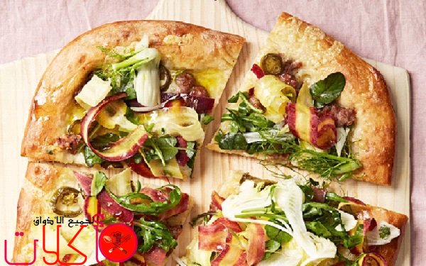 - نترك البيتزا جانباً كي تبرد وفي هذه الأثناء نقشر الجزر ونقسمه إلى شرائح بالمقشرة ثم نقطع الشمر إلى شرائح . نخلط الجزر والشمر والجرجير مع المحلول الملحي للمخلل و 2 ملعقة كبيرة زيت وملح وفلفل .