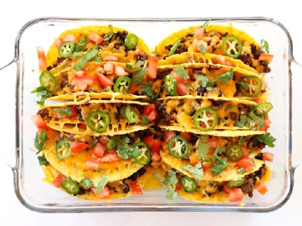- نحمي الفرن لدرجة حرارة 400 فهرنهايت، ثم نرتب قطع التاكو في طبق الفرن ثم نملؤها بحشوة اللحم والفاصوليا ونرش برش الشيدر فوق كل قطعة ونضع الطبق في الفرن لمدة 7 – 10 دقائق حتى تذوب الجبنة ويصبح التاكو ذهبياً .