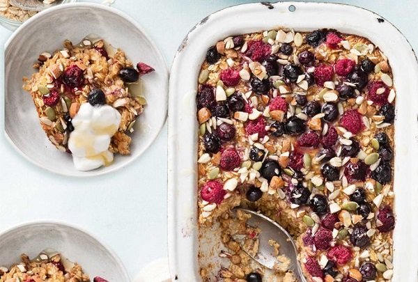 - أضيفي مزيج البيض إلى مزيج الشوفان حركيهم ليتجانسوا، ثم اسكبي الخليط في الصينية المجهزة. رشي التوت، بذور دوار الشمس واللوز.