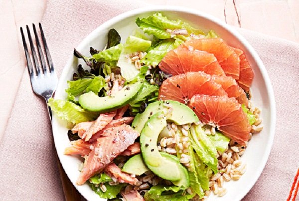 الجريب فروت للتخسيس ، سلطة الجريب فروت أكثر من شهية ورائعة فهي مغذية وصحية أيضاً لأنها تحتوي على القمح الغني بالألياف والمناسب للريجيم إلى جانب مزيج رائع من الجريب فروت والأفوكادو والخس وسمك السلمون المدخن مع صلصة من عصير الجريب فروت والكراث والخردل .