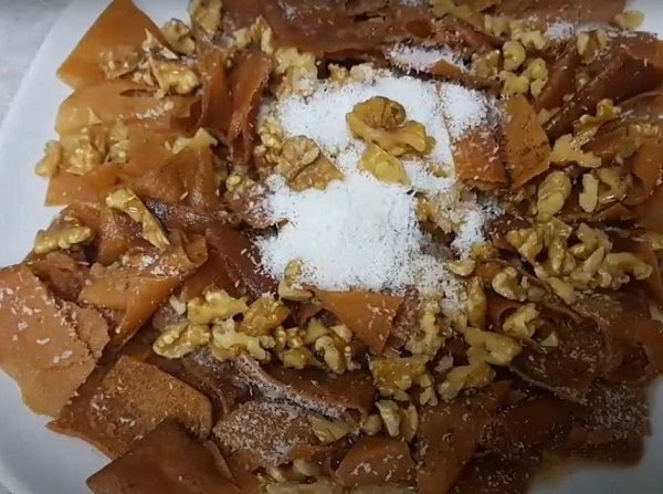 - نسكب الحلى في طبق ثم نرش عليهم جوز الهند والمكسرات حسب المتوفر ونقدمه ساخن وصحة وهنا .