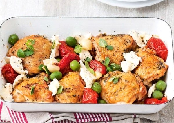 - نضع الطماطم والثوم حول قطع الدجاج ونعيده إلى الفرن لمدة 20 دقيقة إضافية، ثم نضع الزيتون ونطهو الدجاج لـ 5 دقائق أخرى . نزين الطبق بالموزاريلا والأوريغانو المتبقّي وبذلك يكون جاهزاً للتقديم .