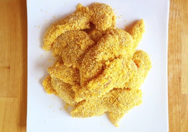 الدجاج بدقيق الذرة بنكهة شهية ومقرمشة يتم اتخاذها كمقبلات فاتحة للشهية مع أطباق الشوربة الكريمية، ويتم تحضيرها بثلاث خطوات من التحميص حتى ينضج الدجاج جيداً .