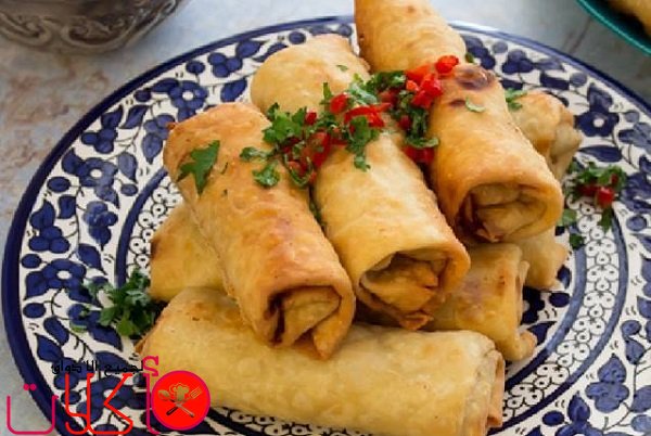 - – تفرد ورقة من الرقاق الطري وتوضع 3 ملاعق من حشو اللحم ثم يلف على شكل رول