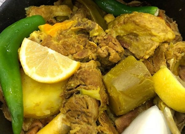 - نحمي قدر عميق ونضيف القليل من الزيت ونسخنه ثم نضيف البصل والثوم ونحرك ثم نضع قطع اللحم والملح والتوابل ونغمره بماء ساخن ونترك المكونات على نار عالية لمدة 30 دقيقة تقريباً حتى ينضج اللحم .