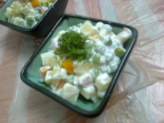 - نضع الخضروات في طبق عميق ونضيف عليه ملعقتين او ثلاثه من المايونيز ( حسب كمية الخضروات ) ونخلط المكونات جيدا وتقدم .