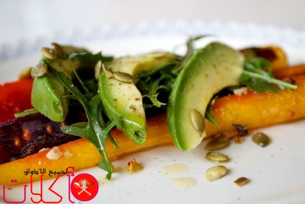 السلطة بشكل جديد ، تتكون هذه السلطة من الجزر المحمص بالفرن مع الزبيب والصنوبر إلى جانب قطع الأفوكادو وخلطة مكسيكية رائعة من التوابل، الليمون، والملح.