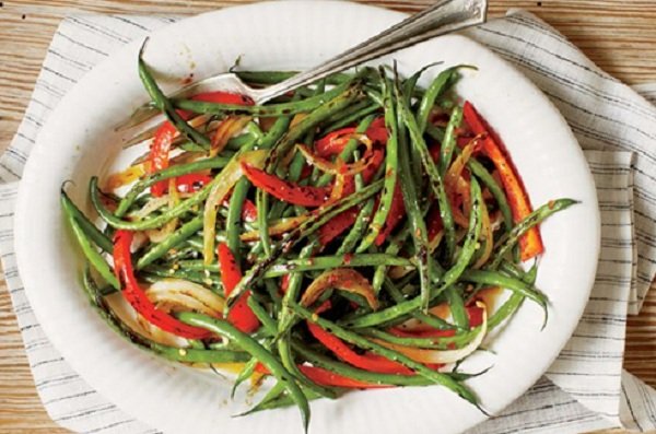 - ثم نضع الزيت في مقلاة كبيرة على نار عالية، ونضيف إليها شرائح الفليفة الحمراء وشرائح البصل والفاصوليا الخضراء، ونطهو لمدة 3 إلى 5 دقائق أو حتى تنضج الفاصولياء ثم نرش الملح