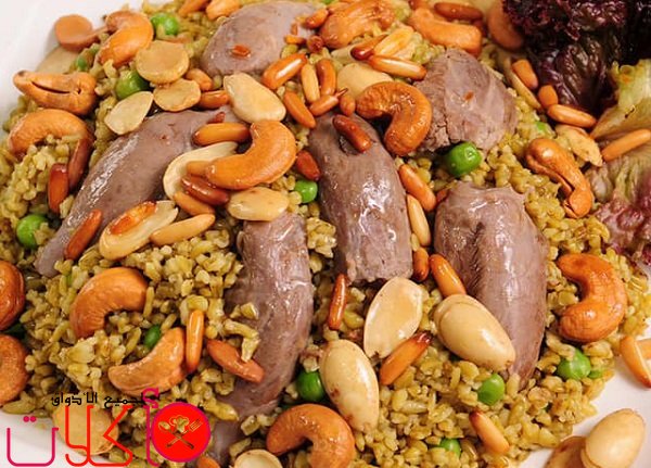- نسكب الفريكة في الطبق المناسب ونزينها بقطع اللحم المسلوق والمكسرات بعد تحميصها بالسمنة وتصبح جاهزة للتقديم .