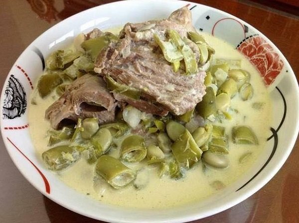 - عن غليان اللبن نخفف النار و نضيف اللحم و الفول الى اللبن و نترك جميع المكونات تغلي لمدة 5 دقائق ليصبح الطبق جاهز للتقديم .