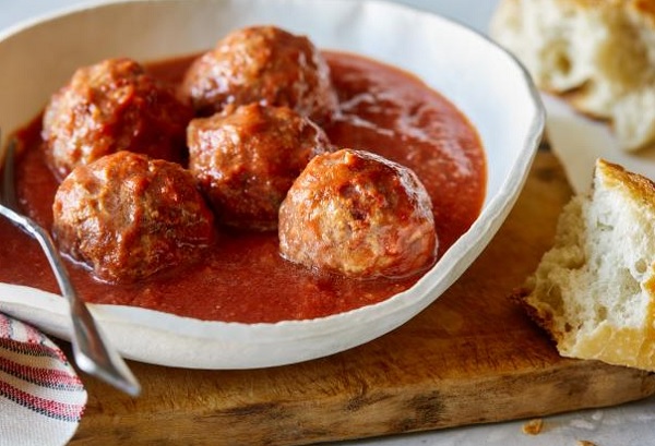- ندخل الوعاء إلى الفرن مدة عشر دقائق لتتشرب اللحمة طعم صوص البندورة ويصبح طبقنا جاهزاً للتقديم .