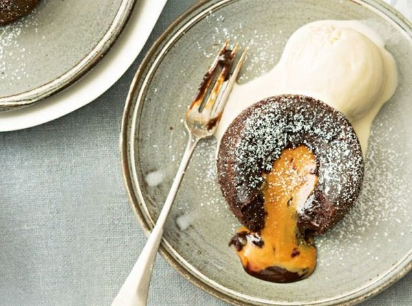 الكب كيك بحشوة الكراميل مع مغرفة من آيس كريم الفانيلا الناعم تصنع هذه الحلوى الساخنة، الحلوة والمالحة في آن واحد. حيث تتكون من الشوكولاتة مع حشوة من الكراميل المملح. وتحضيرها أسهل كثيراً مما يبدو عليه شكلها.