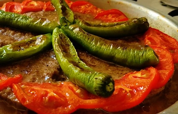 - ندهن صينية الفرن بالزيت ونمد اللحمة فيها ونزينها بشرائح الطماطم .