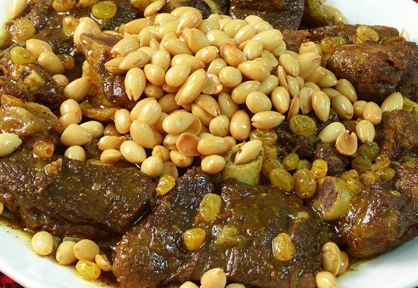 - قبل الطهي بقليل نغمر الزبيب بالماء ونضعه جانباً بينما نطهو اللحم ثم نصفيه ونستخدمه .