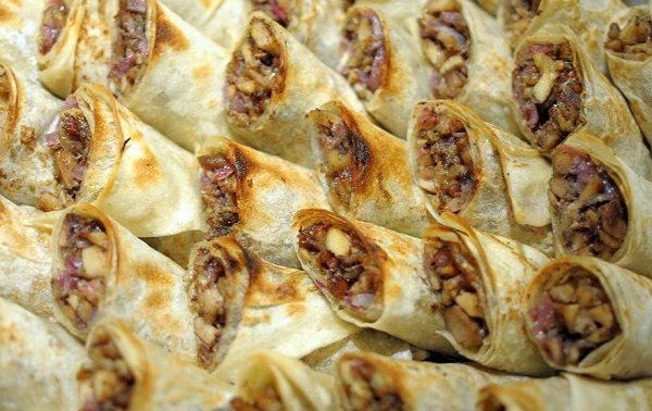 - ونضع بعض من مزيج الدجاج والصنوبر على لفات الخبز، ثم نثنيها على شكل أسطوانات أو “رولات”.