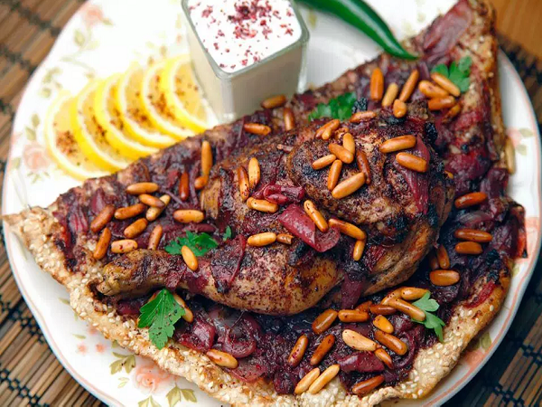 - – يرص الدجاج المشوي على الخبز والبصل ويزين بالصنوبر والسماق