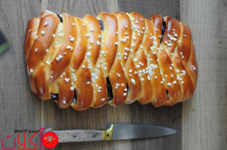 5- نقسم العجينة الى اربع اقسام ونتركها لترتاح قليلا ثم نمد كل قسم بسكل مستطيل وباستخدام السكين نقوم بانشاء شقوق كحراشف السمكة ونضع في الوسط القليل من حشوة الشوكولا التي يجب ان تكون جامدة قليلا نقلق العجينة على شكل ضفيرة