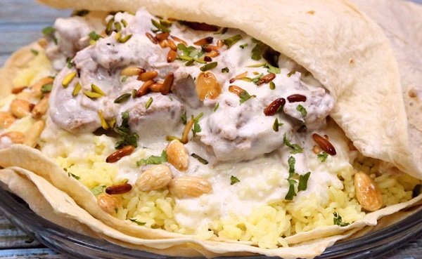 - – ويقدم منسف الدجاج مع الجميد ويزين بالبقدونس.