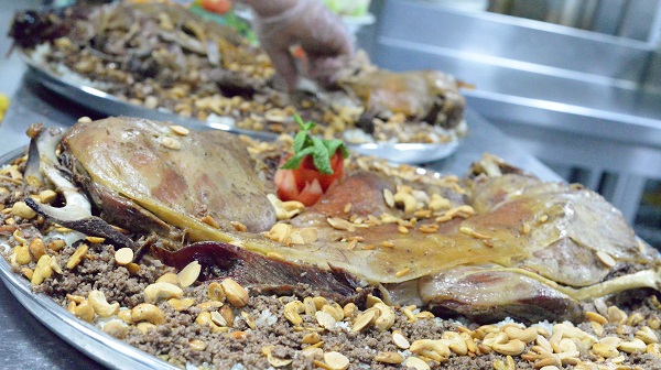 - – في وعاء التقديم، ضعي الأرز والبرغل، واللحم، وزينيهبالمكسراتالمحمصة.
