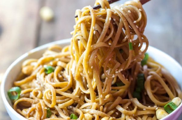 النودلز الصيني بالفول السوداني ، طبق جانبي لذيذ سيحبه الأطفال بالتأكيد، باستا مع تتبيلة من زبدة الفستق، صويا، خل، زنجبيل، عسل، شطة حارة وعصير الليمون وقشر مبشور. مع خضار .
