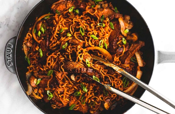 النودلز الكوري بالاندومي و اللحم لا تحتاج سوى لمقلاة واحدة فلا تسبب أي فوضى في مطبخكم وهي تحتوي على صلصة حارة كورية شهية مع النودلز والبصل والفطر وبذلك يكون العشاء جاهزاً خلال 30 دقيقة فقط .