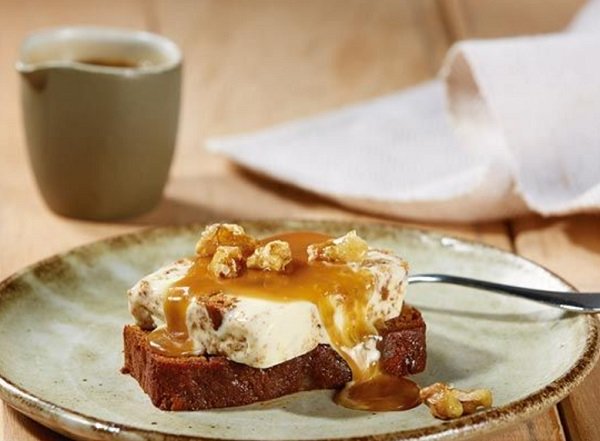 - قطعي بودينغ التمر المتبقي إلى 8 شرائح، قدمي شريحة من الآيس كريم على وجه كل قطعة بودينغ، ورشي فوقهم البترسكوتش الساخن.