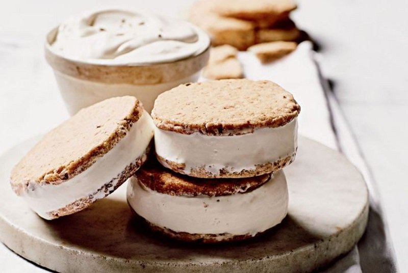 - ضعي نصف البسكويت على لوح، بحيث يكون الجانب السادة لأعلى، ضعي 1 مغرفة من الآيس كريم على كل بسكويتة، ثم ضعي طبقة ثانية من البسكويت فوق الآيس كريم. قدميهم مباشرة أو جمديهم بالفريزر لأكثر من شهر.