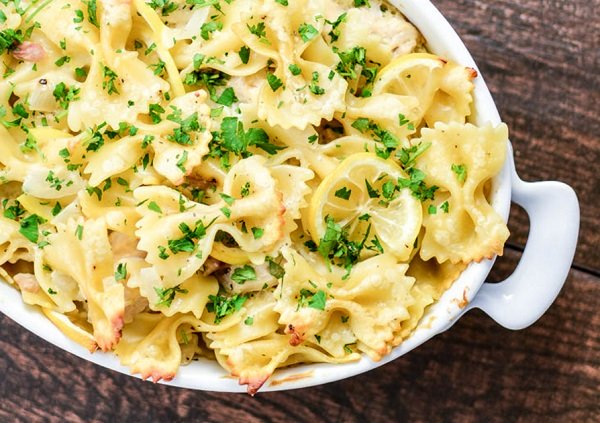 باستا الدجاج بالليمون بالفرن مع نكهة رئيسية لليمون بالطبق، ويطهى بمرق الدجاج والحليب، مع طبقة خفيفة من البارميزان والبقدونس المفروم، ويقدم عادة مع شرائح الليمون وصلصة اللبن والثوم
