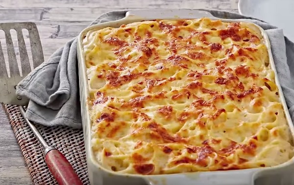 - أضيفي قطع الدجاج المدخن و اسكبي مزيج البشاميل