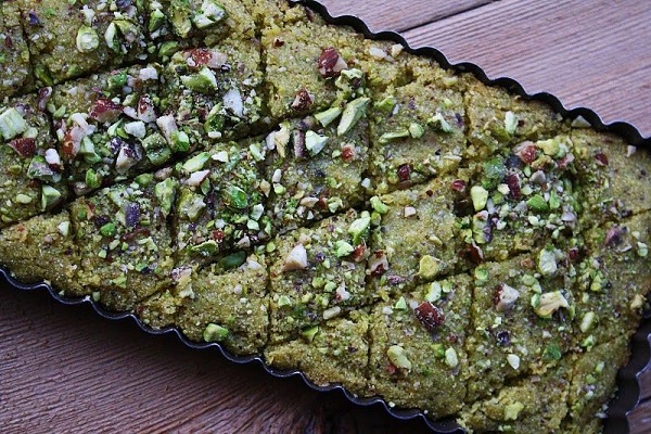 بسبوسة الفستق الحلبي حلى مكون من سميد وجوز هند معجون بالقشطة والحليب ومشرب بالقطر بلون وطعم رائعان ستحبه العائلة والأصدقاء بالتأكيد .