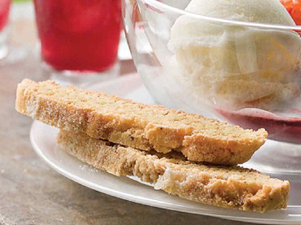 - رتبي الشرائح يحيث يكون الجانب المسطح إلى أسفل على صينية فرن واخبزيهم حتى تصبح هشة واللون ذهبياً بنياً من 15 – 18 دقيقة. ثم انقليهم إلى شبك التبريد، واتركيهم ليبردوا بالكامل.