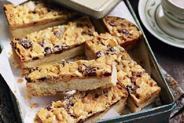 - لتحضير الطبقة العلوية: ضعي الزبدة، السكر والكريمة في مقلاة متوسطة على نار هادئة حتى يذوب السكر واتركيهم ليغلوا. لمدة دقيقة، أبعديهم عن النار وحركي معهم الطحين، رشة من الملح وقشر البرتقال، اللوز، والتوت. ثم اسكبي الخليط فوق البسكويت ومدديه بالتساوي، واخبزيهم لمدة 20 دقيقة أو حتى يصبح اللون ذهبياً بنياً وتتشكل الفقاعات.