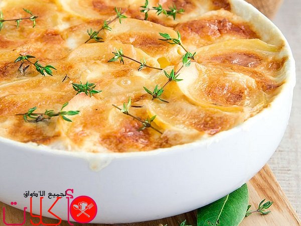 - في طبق البايركس نصف طبقة من البطاطا ثم نوزع الحشوة بشكل متساوي ثم باقي كمية البطاطا وندخله الفرن على حرارة 180 حتى تنضج البطاطا .