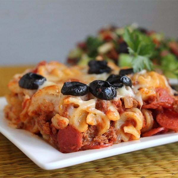 - قدمي بيتزا المكرونة بالبيبروني مع البطاطس المحمرة.